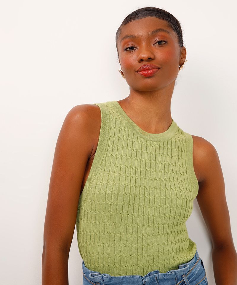 Sugestões de Uso e Combinações Para um visual casual e moderno, combine esta regata de tricô com uma calça jeans de modelagem ampla e sandálias flatform. Se a ocasião pede um toque mais elegante, aposte em uma calça de alfaiataria de cintura alta e um blazer, finalizando com acessórios delicados. Sua versatilidade permite que ela seja a base para diversas produções, transitando facilmente do dia para a noite.