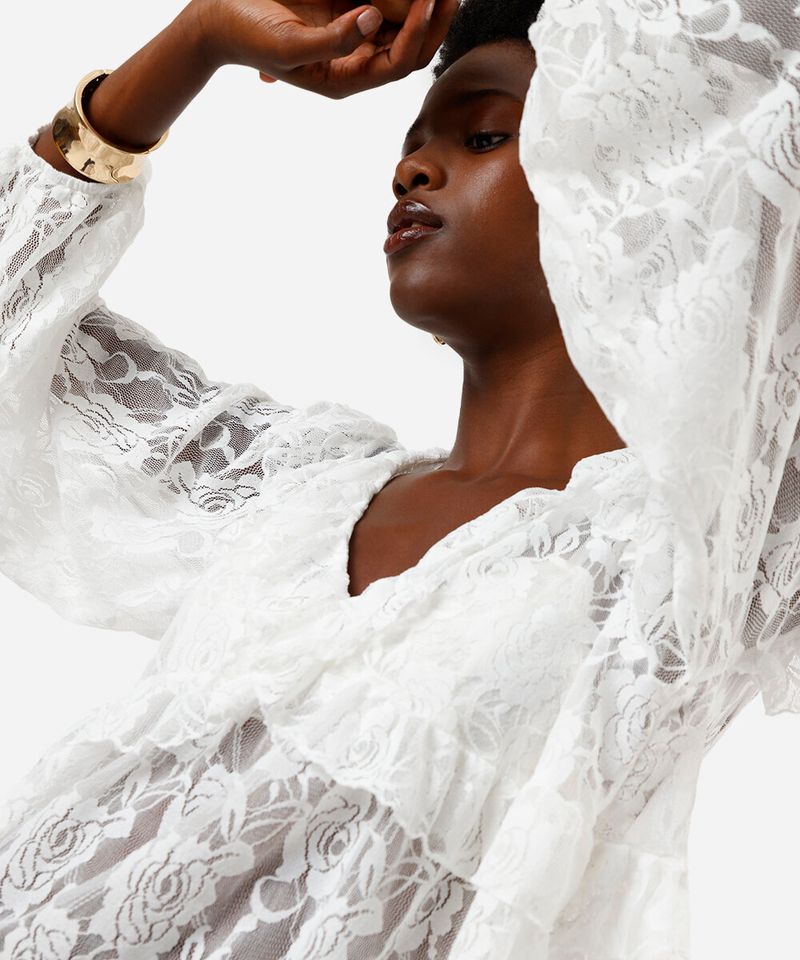 Bata feminina confeccionado em renda com padronagem floral. A peça tem modelagem reta e caimento solto ao corpo. O modelo tem decote em V com babados aplicados e mangas longas bufantes com elástico embutido nos punhos. Não possui forro./38
