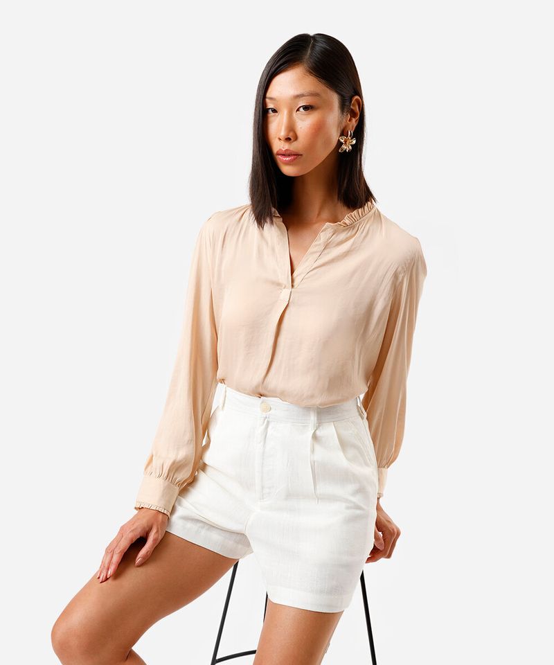 Bata feminina confeccionada em tecido plano com toque levemente acetinado. A peça possui modelagem reta, caimento solto e fluido, decote V decorado com babado drapeado, mangas longas com abotoamento nos punhos e acabamento pespontado.