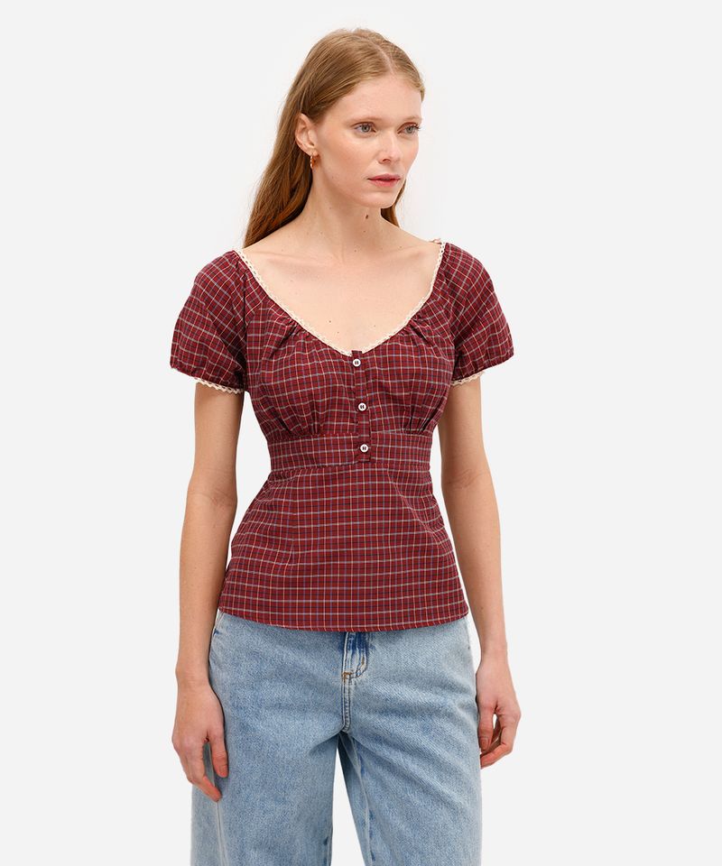 Esta blusa feminina traz a combinação perfeita entre o clássico e o romântico. Com uma charmosa padronagem xadrez e detalhes delicados, é uma peça versátil que transita facilmente entre o casual e o arrumadinho. Confeccionada em tecido plano de algodão e poliéster, oferece um toque macio e um caimento confortável para acompanhar você no dia a dia.