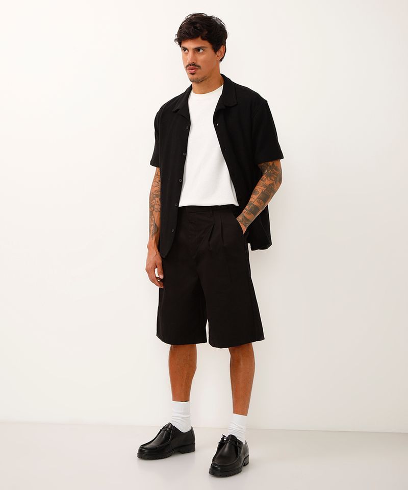 Sugestões de Uso e Combinações Versátil, esta bermuda preta masculina transita facilmente entre diferentes estilos. Para um visual casual, combine-a com uma camiseta básica e tênis. Se a ideia é um look mais arrumado e urbano, aposte em uma camisa de manga curta e sapatos de couro, como um loafer ou derby. É a escolha certa para quem busca uma peça-chave para diversas ocasiões.