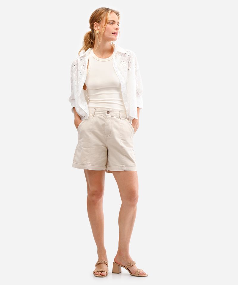 Esta bermuda feminina se destaca por seus detalhes cuidadosamente pensados: