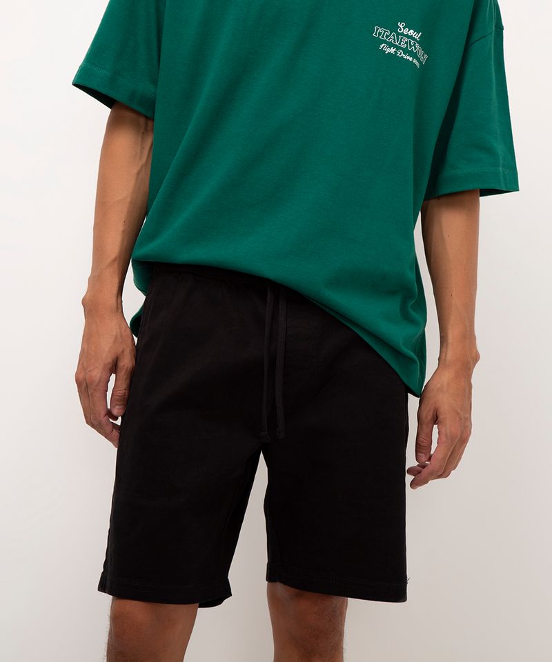 Bermuda confeccionada em sarja. A peça possui cós elástico com cordão embutido, dois bolsos frontais e um posterior. Caimento reto, comprimento curto e acabamento pespontado. Fechamento frontal amarração.