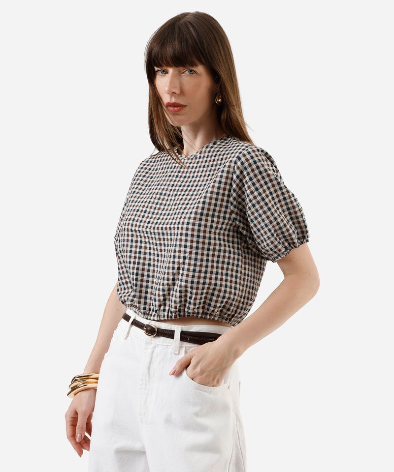 Blusa feminina confeccionada em tecido plano com algodão e estampa xadrez. A peça tem modelagem reta, caimento solto ao corpo e comprimento cropped. O modelo tem decote redondo, abertura posterior por botão e mangas bufantes curtas com elástico nos punhos. /38