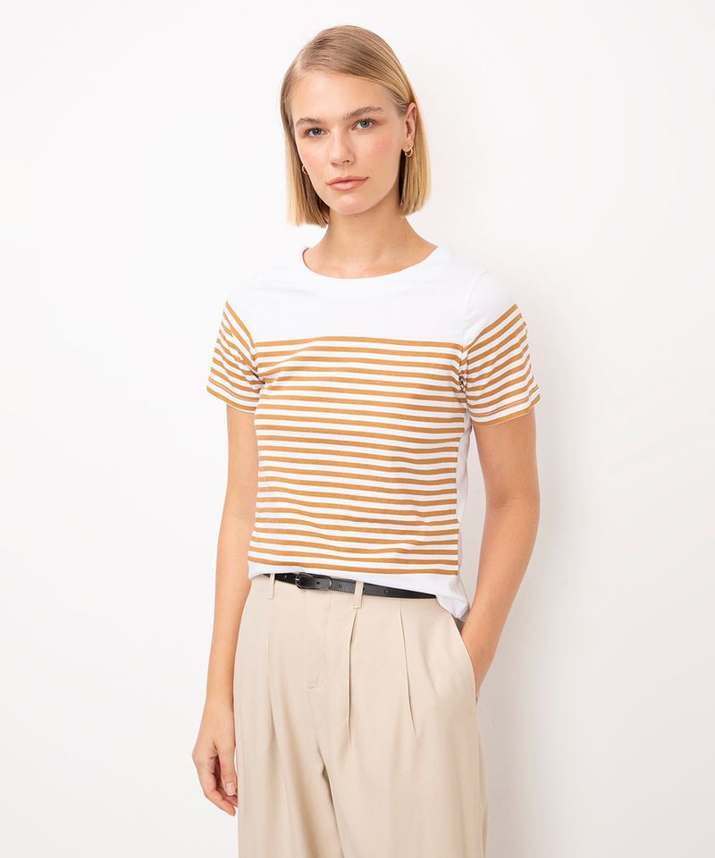 Esta blusa de manga curta se destaca por seus detalhes que unem o clássico e o moderno:
