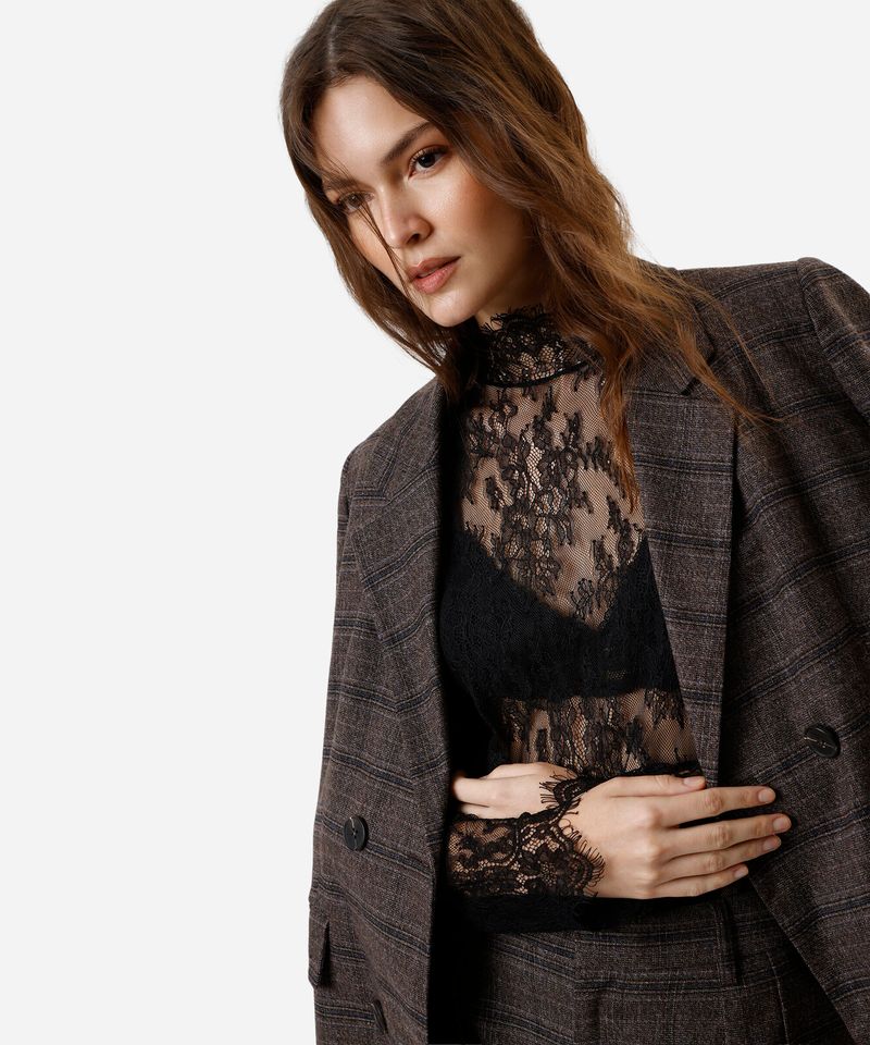 Blusa feminina confeccionada em renda com padronagem floral. A peça tem a modelagem e construção reta e o caimento é confortavelmente solto ao corpo. O modelo tem gola alta, abertura por botões e mangas longas. Detalhe de acabamento pespontado na barra. Não possui forro. /38