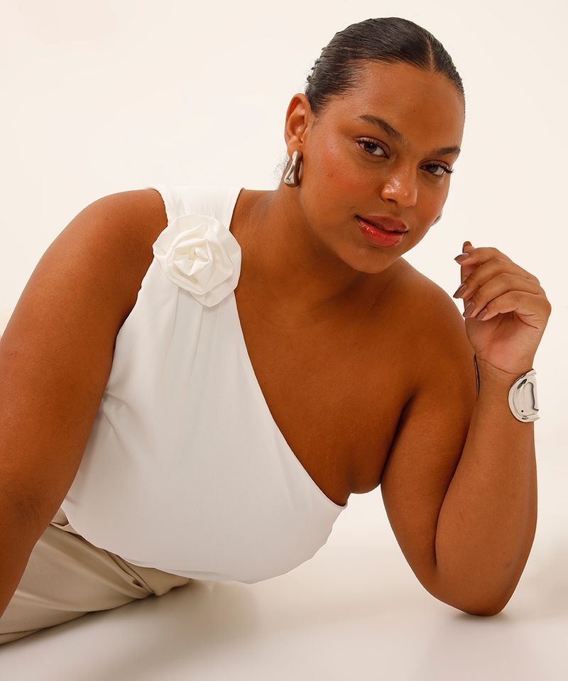 Eleve seus looks com esta blusa plus size que é a definição de elegância moderna. Seu design de ombro único, combinado com a delicada aplicação de flor, cria um visual sofisticado e marcante, perfeito para ocasiões especiais. Confeccionada em tecido plano leve, a peça oferece um caimento fluido que valoriza com conforto e estilo.