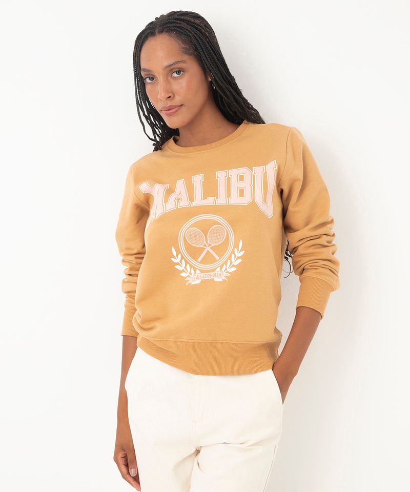 Vista conforto e estilo com este blusão de moletom feminino, a escolha perfeita para os dias mais amenos. Confeccionado em moletom encorpado e macio, ele oferece um toque aconchegante por conta da sua parte interna felpada. A estampa frontal com inspiração college traz um ar jovem e despojado, ideal para compor looks casuais cheios de personalidade.