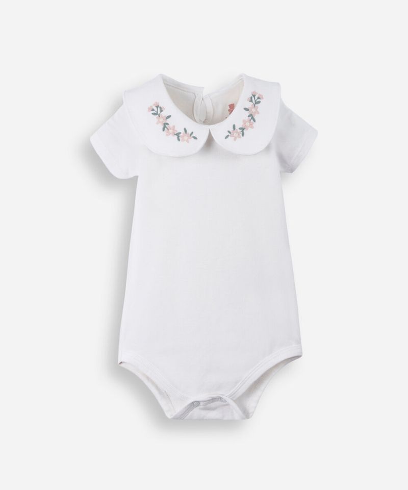Este body infantil é a escolha perfeita para vestir sua bebê com muito charme e conforto. Confeccionado em uma malha de algodão macia, ele proporciona um toque suave na pele delicada, enquanto a gola boneca com bordado floral adiciona um toque de doçura ao visual. Uma peça versátil e encantadora para compor os looks mais fofos do dia a dia.