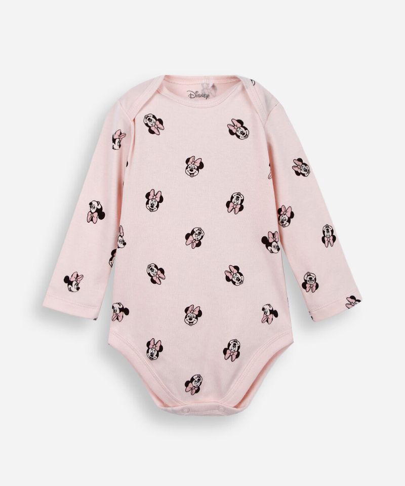 Body infantil confeccionado em malha macia de algodão com estampa temática da Minnie. A peça tem modelagem reta e caimento solto ao corpo. O modelo tem decote redondo e mangas longas. O fechamento é por botões de pressão no entrepernas.