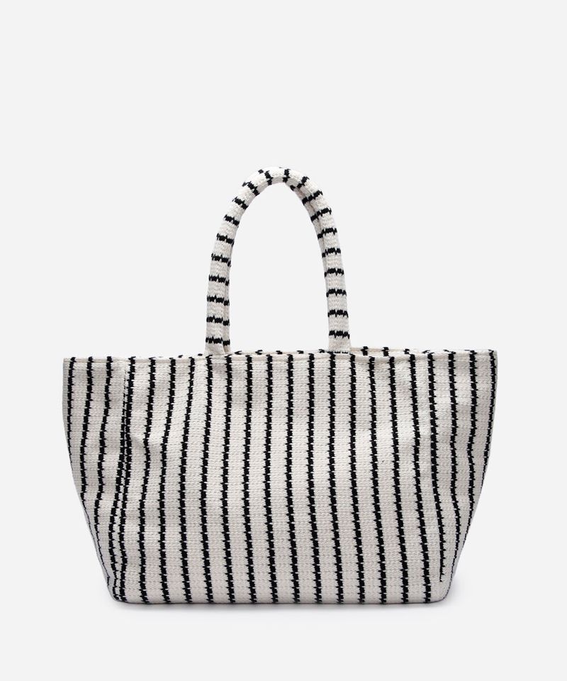 Bolsa feminina desenvolvida em tecido resistente com padronagem listrada. A peça possui formato tote, alça de ombro fixa, forro e acabamento pespontado.