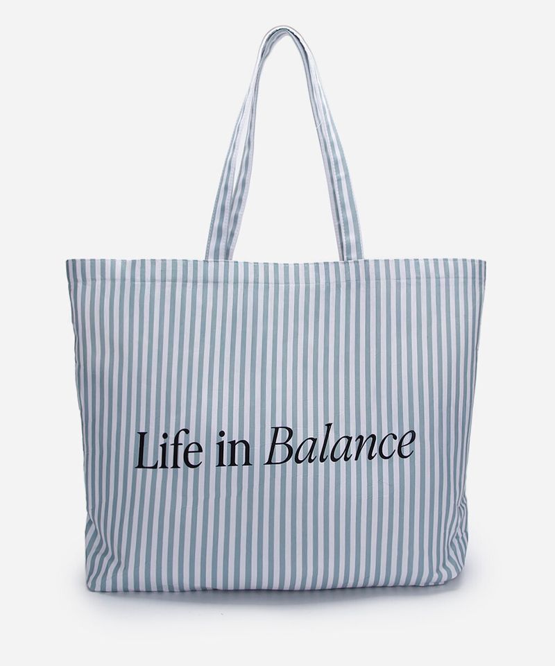 Bolsa tote desenvolvida em material sintético com base de algodão, estampa listrada e frase "life in balance". O modelo tem formato retangular alças duplas de ombro.