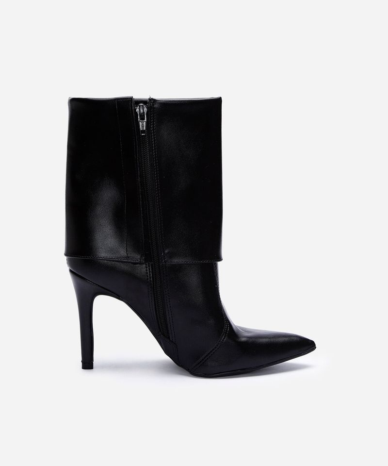 Bota feminina desenvolvida em material sintético resistente. O modelo tem bico fino e cano médio, cabedal liso com sobreposição no cano e fechamento por zíper. Possui palmilha com leve enchimento, salto fino, alto e sola texturizada que auxilia no caminhar.