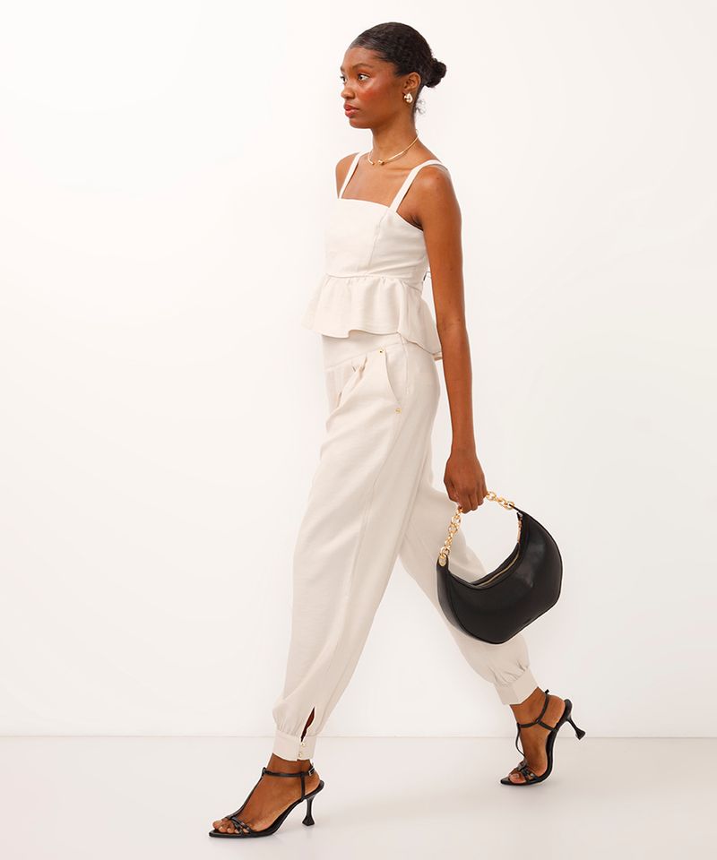 Sugestões de Uso e Combinações Esta calça baggy é extremamente versátil. Para um look de trabalho moderno, combine-a com uma camisa social e scarpin. Se a ideia é um visual casual-chic para o fim de semana, aposte em uma t-shirt básica, um top cropped ou uma regata e complete com tênis ou sandálias rasteiras. A peça transita facilmente entre o dia e a noite, adaptando-se ao seu estilo.
