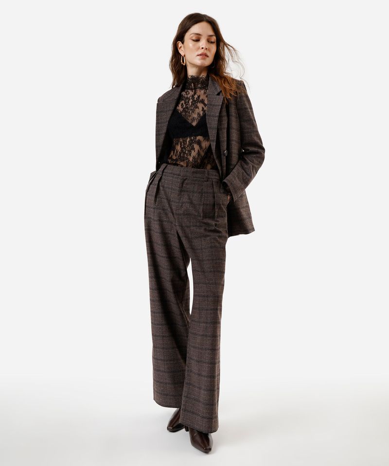 Calça de alfaiataria feminina confeccionada em tecido plano com padronagem xadrez. A peça tem a modelagem baggy, com construção reta e caimento amplo e solto ao corpo. O modelo tem cintura alta, pregas frontais, cós com passantes para cinto e fechamento frontal por botão e zíper. Possui dois bolsos na parte frontal e acabamento com pesponto nas barras./38