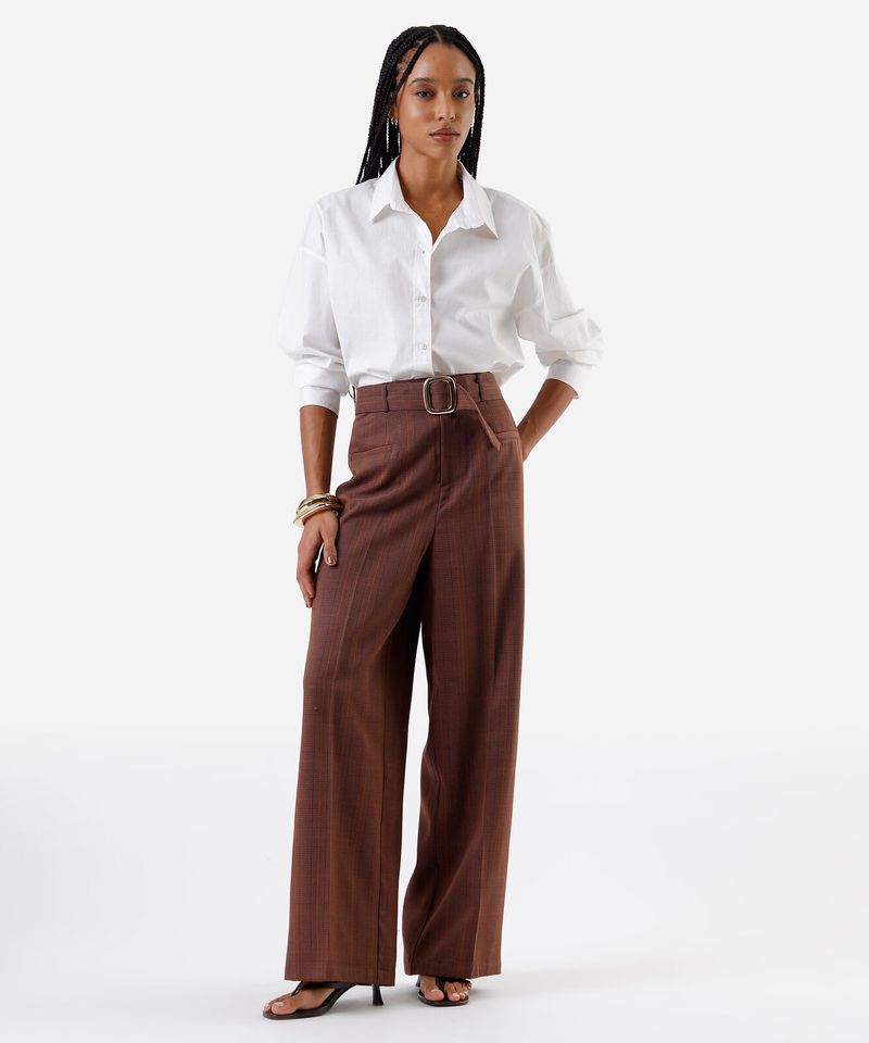 Calça de alfaiataria feminina confeccionada em tecido plano com padronagem xadrez. A peça tem a modelagem reta e o caimento solto ao corpo. O modelo tem cintura alta, cós com passantes, cinto no mesmo material da peça e fechamento por botão e zíper. Possui dois bolsos embutidos na parte frontal e acabamento pespontado nas barras./38