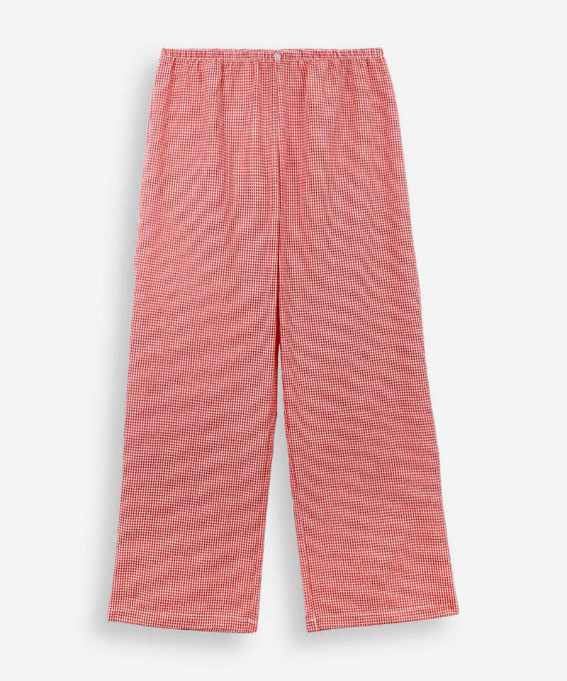 Calça de pijama feminina confeccionada em tecido plano com algodão e estampa xadrez. A peça tem a modelagem e construção reta e o caimento é confortavelmente solto ao corpo. O modelo tem cintura alta, cós com elástico embutido e botão decorativo. Detalhe de acabamento pespontado nas barras.