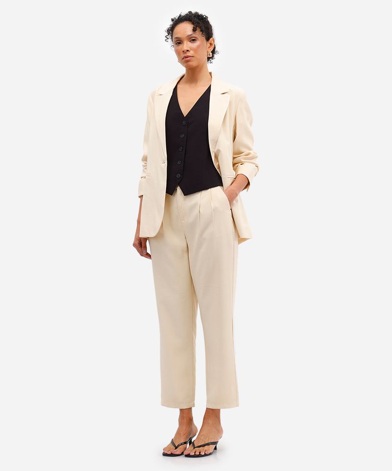 Sugestões de Uso e Combinações Para um visual de trabalho impecável, combine esta calça de alfaiataria com um blazer no mesmo tom, uma blusa de seda e sapatos de salto. Se a ideia é um look mais descontraído e moderno, aposte em uma camiseta básica, um tênis branco e acessórios minimalistas. Sua versatilidade permite transitar facilmente entre diferentes ambientes, sempre com um toque de sofisticação.