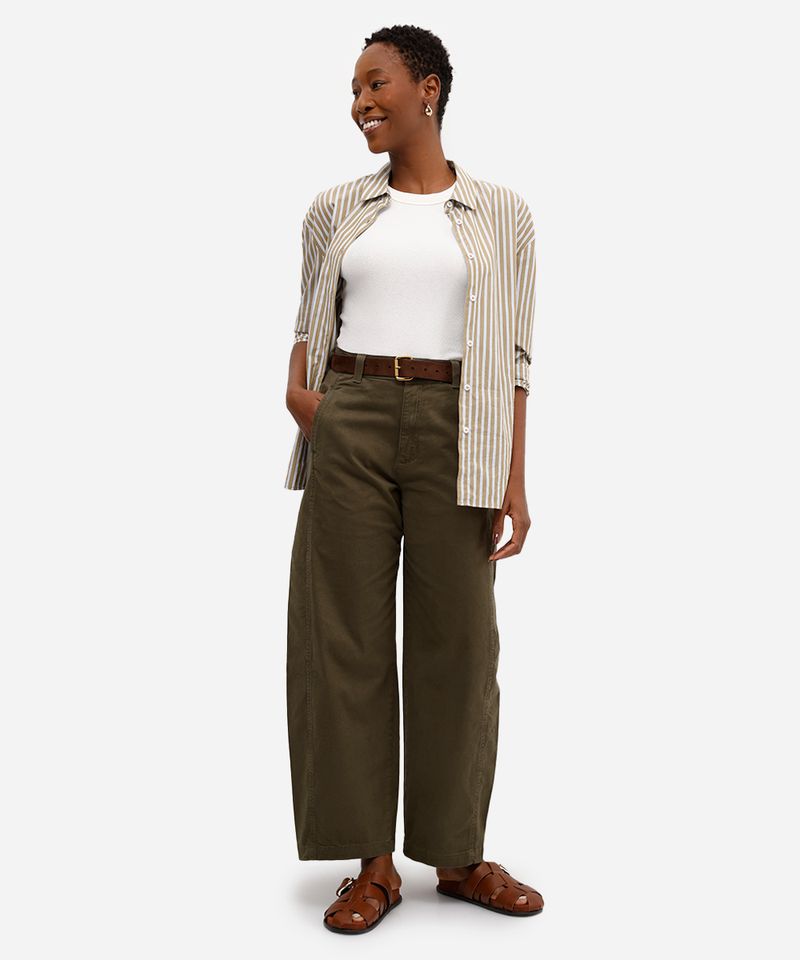 Esta calça feminina de sarja se destaca por seus detalhes: