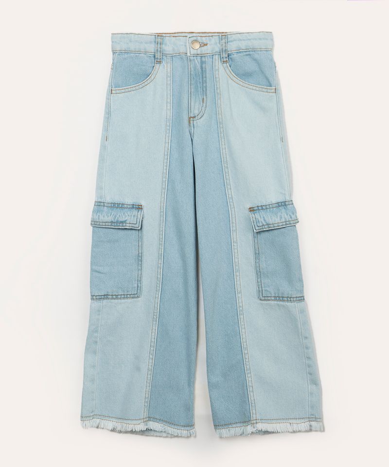 Renove o guarda-roupa das pequenas com esta calça jeans infantil super estilosa. Com modelagem wide leg, que é uma tendência forte, esta peça une conforto e informação de moda em um só design. O efeito bicolor e os bolsos cargo dão um toque moderno e divertido, perfeito para as meninas que adoram se expressar através do look. Confeccionada em jeans de algodão, ela garante liberdade para brincar e se movimentar.