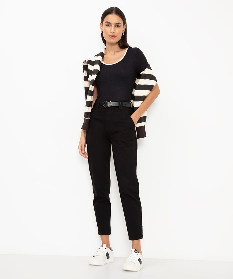 Renove seu guarda-roupa com a versatilidade da calça mom de sarja. Esta calça preta feminina combina o conforto de um caimento mais solto com a elegância da cintura alta, sendo a escolha perfeita para criar looks modernos e despojados. Confeccionada em sarja com toque macio, ela se adapta ao corpo e acompanha você em todos os momentos do dia.