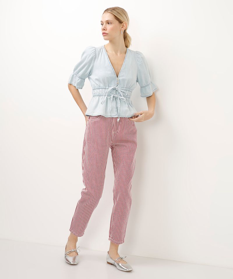 Renove seu visual com esta calça jeans mom listrada, a peça perfeita para quem busca unir conforto e um toque de ousadia. Com uma modelagem que remete aos clássicos dos anos 90, esta calça jeans feminina cintura alta oferece um caimento soltinho e super confortável. Sua padronagem listrada vibrante é ideal para criar produções cheias de personalidade, seja para o dia a dia ou para momentos especiais.