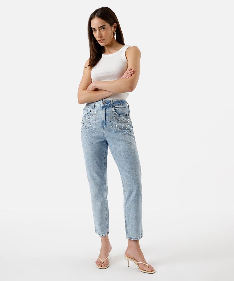 Renove seu visual com esta calça jeans feminina que une o conforto da modelagem mom com o glamour das aplicações de brilho. Com um caimento mais solto ao corpo e confeccionada em jeans 100% algodão, esta peça oferece um toque estruturado e autêntico, garantindo estilo e bem-estar. Perfeita para criar looks que vão do casual ao sofisticado, esta calça jeans larga feminina é um item indispensável para quem busca versatilidade com um toque de personalidade.