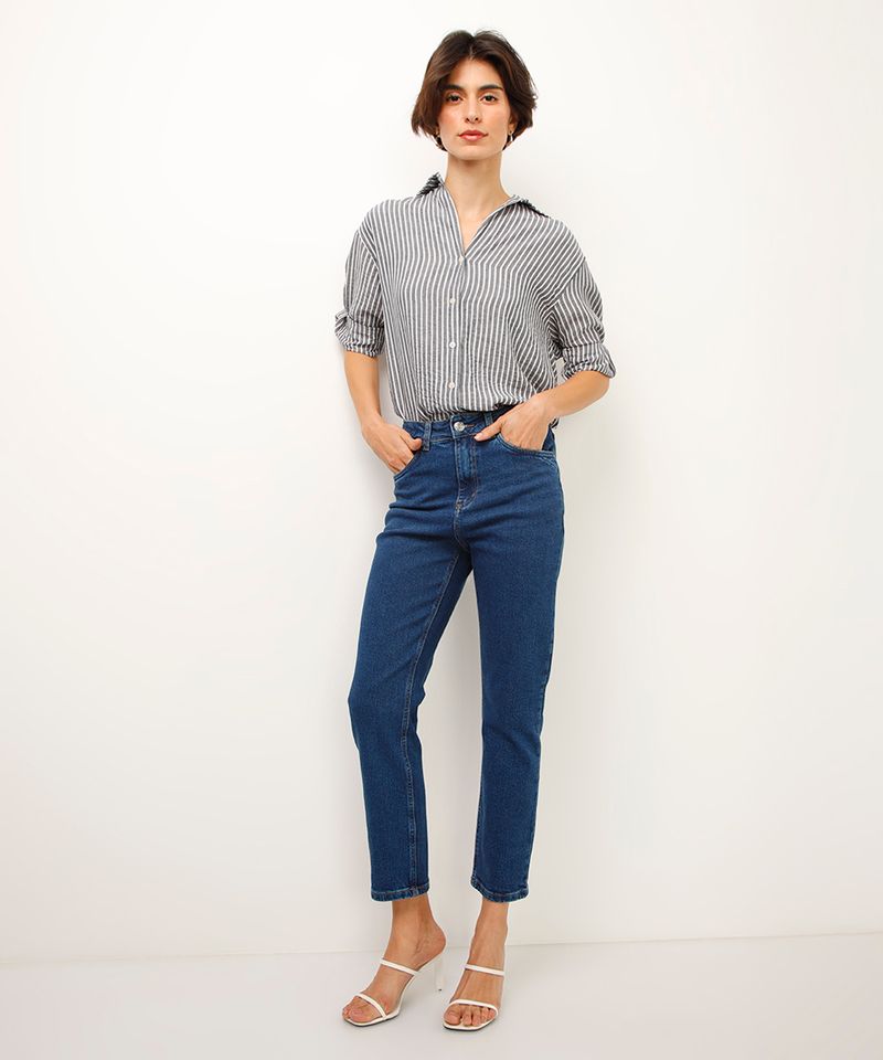 Esta calça jeans feminina é a peça que faltava para um guarda-roupa versátil e cheio de estilo. Com uma modelagem slim que se ajusta confortavelmente ao corpo, ela combina o clássico e o moderno de forma única. A cintura alta proporciona um caimento elegante, tornando-a perfeita para criar looks para o dia a dia, do trabalho ao lazer.