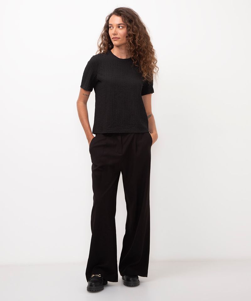 Sugestões de Uso e Combinações Esta calça preta feminina é extremamente versátil. Para um look de trabalho elegante, combine-a com uma camisa de seda e um blazer feminino de alfaiataria acinturado. Se a ideia é uma produção mais casual e moderna, aposte em uma blusa de tricô ou um top cropped com tênis de plataforma. Para ocasiões noturnas, use com um body acetinado e sandálias de salto, criando um visual sofisticado e poderoso.