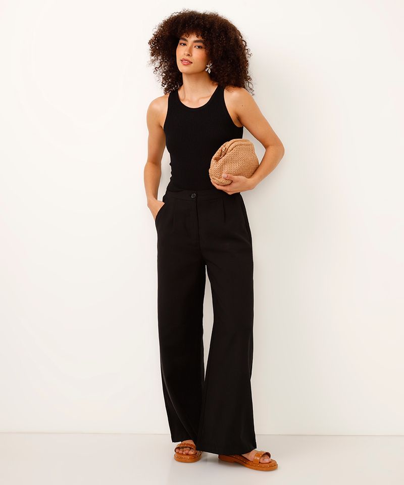 Sugestões de Uso e Combinações Para um look descontraído, combine sua calça wide leg com um top cropped ou uma camiseta básica e sandálias flatform. Se a ocasião pede mais formalidade, aposte em uma camisa de tecido fino ou uma blusa elegante, finalizando com um salto bloco. Esta peça versátil transita facilmente entre o ambiente de trabalho e um passeio no fim de semana.