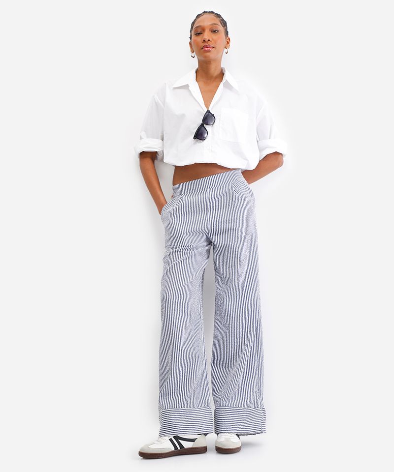 Renove seu estilo com esta calça wide leg feminina listrada, a escolha ideal para quem busca conforto e um visual moderno. Com um caimento fluido e soltinho, esta peça proporciona liberdade de movimento e um toque de sofisticação para o dia a dia. Seu tecido texturizado adiciona uma camada extra de charme, tornando esta calça feminina larga um item versátil para diversas ocasiões.