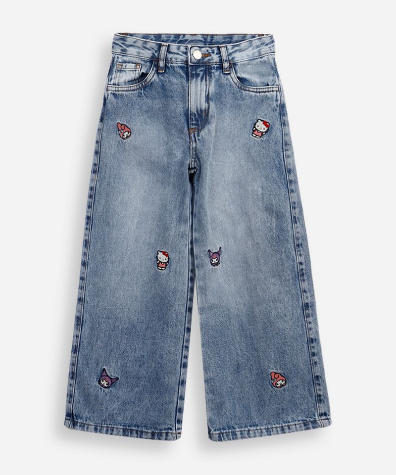 Esta calça jeans infantil é a peça perfeita para adicionar um toque de diversão e estilo ao guarda-roupa das pequenas. Com a tendência da modelagem wide leg, ela proporciona um caimento soltinho e super confortável, ideal para acompanhar as brincadeiras do dia a dia. Os bordados da Hello Kitty e seus amigos trazem um charme lúdico que as crianças adoram, transformando um item clássico em uma peça cheia de personalidade.