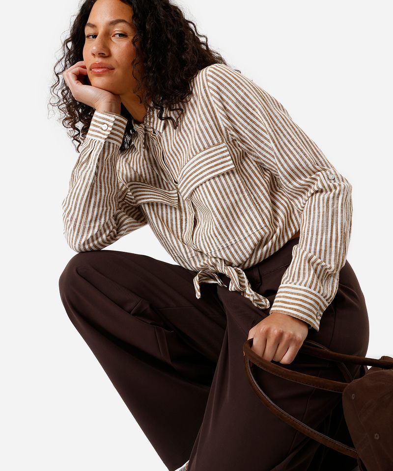 Esta camisa de botão feminina se destaca por seus detalhes únicos: