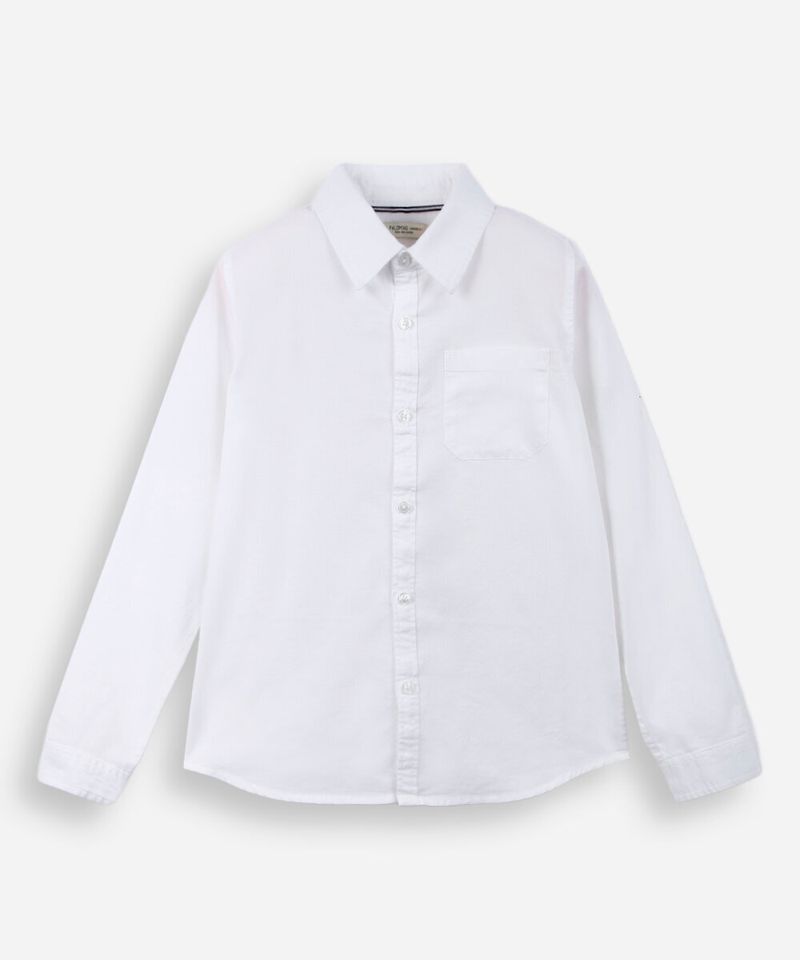 Camisa infantil confeccionada em tecido plano de algodão. A peça possui gola clássica, mangas longas com abotoamento, um bolso frontal, caimento reto, acabamento pespontado e fechamento frontal por botões. Composição: 100% algodão Instruções de lavagem: - Temperatura até 40º - Não alvejar - Não secar em secadora - Secar na vertical - Passar em temperatura média - lavar à seco
