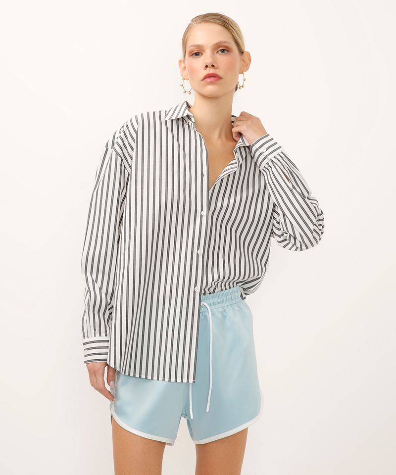 Renove seu guarda-roupa com uma peça clássica e cheia de estilo. Esta camisa feminina listrada é a escolha perfeita para quem busca versatilidade e conforto, sem abrir mão de um visual moderno. Confeccionada em um tecido plano com algodão, ela possui um toque macio e um caimento reto que se adapta bem ao corpo, garantindo liberdade para o seu dia a dia. Uma peça atemporal que transita facilmente entre o casual e o formal.