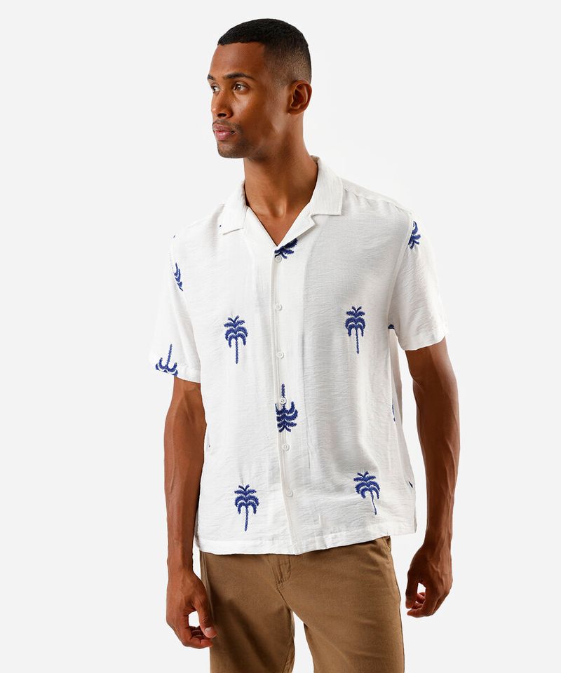 Camisa masculina confeccionada em malha de viscose com sutil textura, toque fluido e leve. A peça possui modelagem reta com caimento solto, gola clássica, mangas curtas, fechamento frontal por botões, estampa bordada com desenho de coqueiros em cor contrastante e acabamento pespontado./42