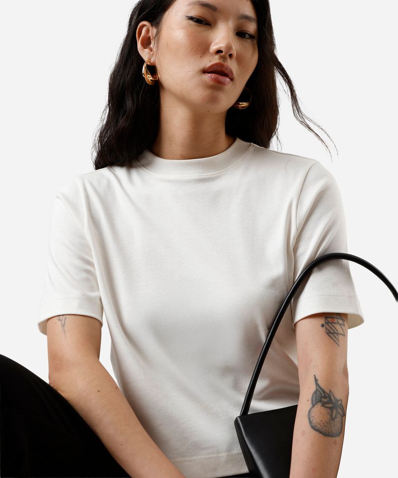 Esta camiseta feminina une o conforto de uma peça básica com um toque de sofisticação. Confeccionada em algodão peruano, seu toque é extremamente macio e o caimento, fluido e elegante. Com um design moderno de comprimento cropped, esta blusa feminina é perfeita para criar looks versáteis que vão do casual ao elegante sem esforço.