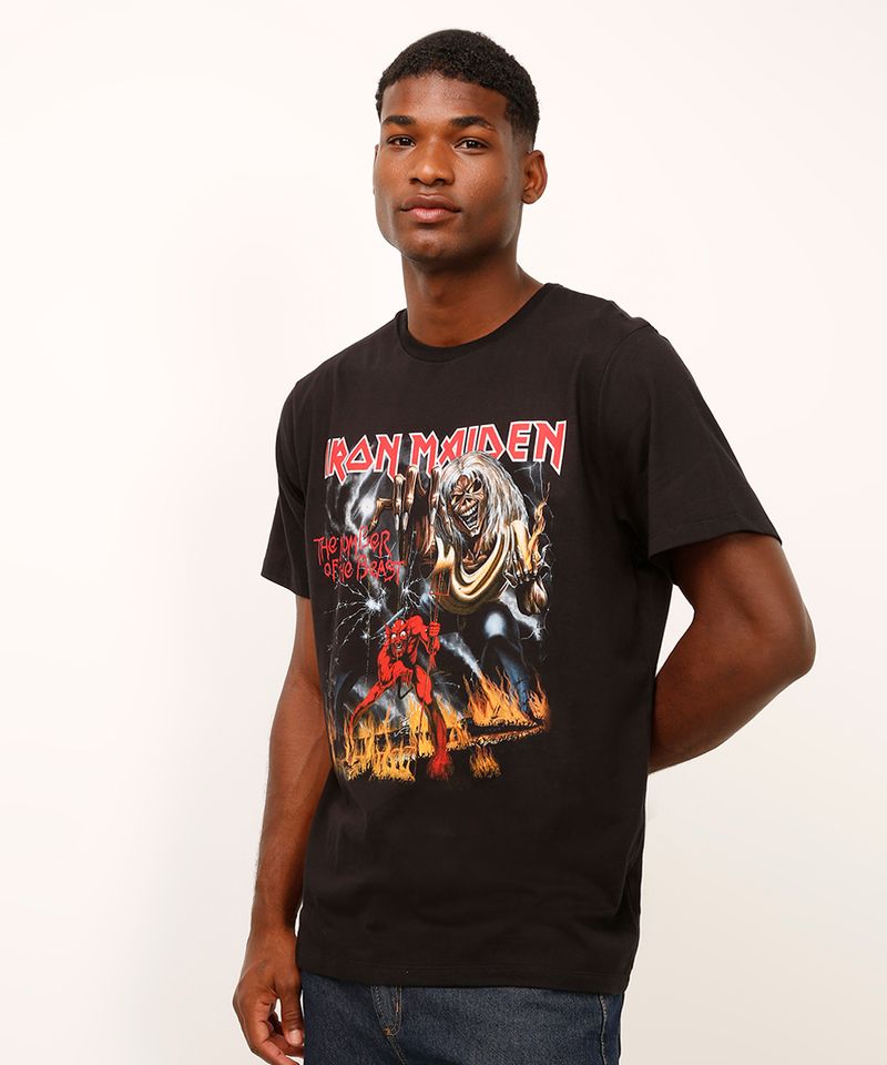 Mostre sua paixão pelo heavy metal com esta camiseta masculina do Iron Maiden. Confeccionada em malha macia 100% algodão, a peça oferece um toque suave e conforto para o dia a dia. Com uma estampa icônica do álbum 'The Number of the Beast', esta camiseta é perfeita para compor looks casuais cheios de atitude, seja para um show ou para o cotidiano.