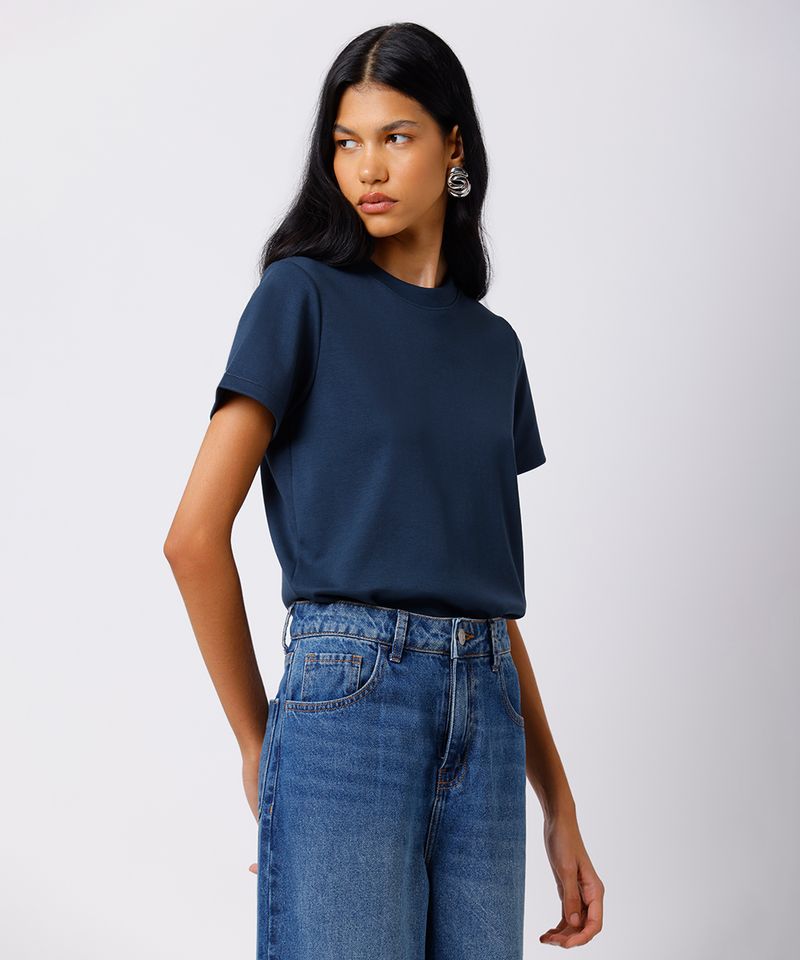 Essencial e versátil, esta camiseta é a base perfeita para construir looks incríveis no dia a dia. Confeccionada em algodão peruano, a peça oferece um toque extremamente macio e um caimento impecável, garantindo conforto e sofisticação em qualquer ocasião. É um item indispensável que une qualidade e estilo atemporal para o seu guarda-roupa.