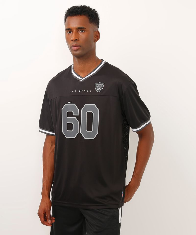 Camiseta esportiva confeccionada em tecido com o toque leve. A peça possui modelagem oversized com caimento reto, decote v canelado com cor contrastante, mangas curtas, estampa frontal com logo e numeração do time da NFL "Raiders" e posterior, tecido com micro furos que auxilia na transpiração do corpo, detalhes de recortes e pequena tag com o logo da marca próximo ao acabamento pespontado.