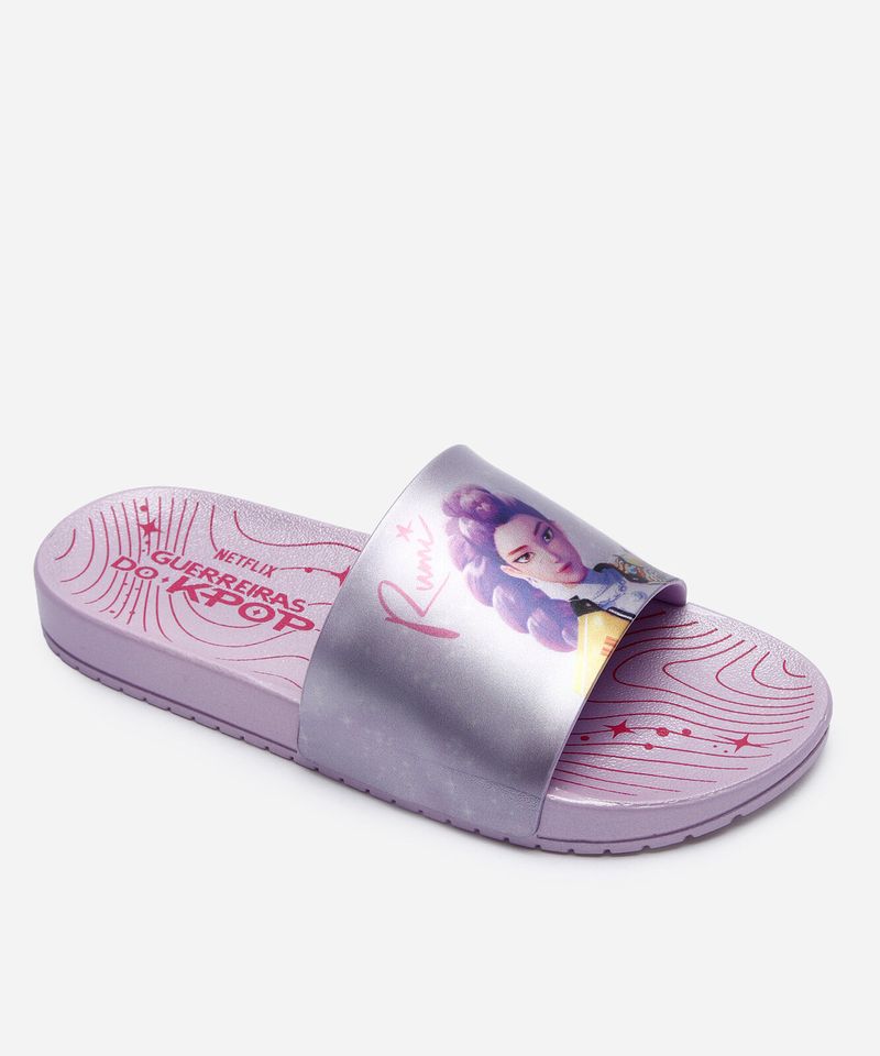 Chinelo infantil produzido em material emborrachado. A peça possui modelo slide, tira larga com estampa da personagem "Guerreiras Do K-pop Hundrix Gaspea", palmilha macia com inscrição de marca e sola texturizada que auxilia no caminhar.
