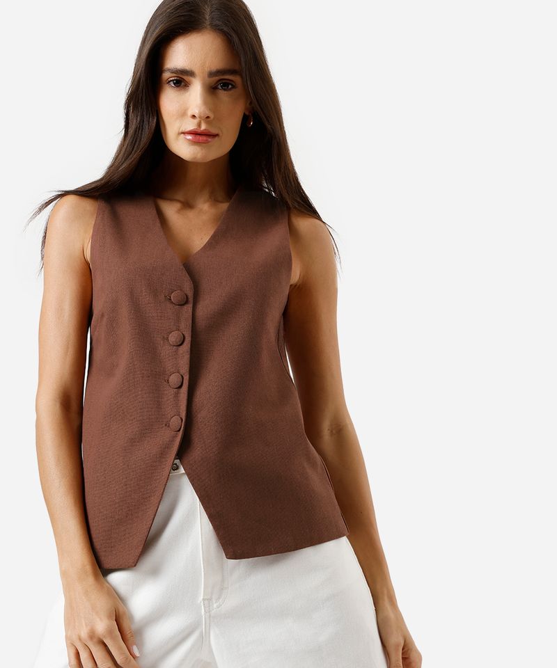 colete alongado feminino de alfaiataria com linho marrom
