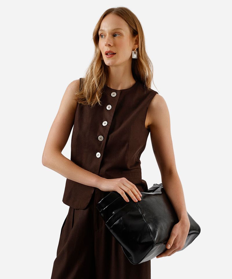 Sugestões de Uso e Combinações Para um visual sofisticado e harmônico, combine este colete com a calça de mesma cor e tecido, criando um conjunto de alfaiataria impecável. Ele também funciona perfeitamente como terceira peça sobre blusas básicas e jeans, trazendo um toque de elegância para o dia a dia. Para uma proposta mais moderna, use-o fechado como um top, combinado com saias ou calças de cintura alta.