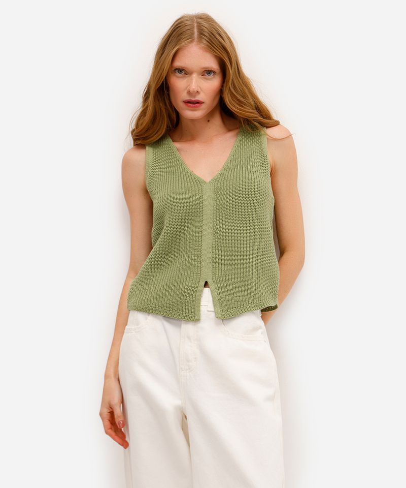 Sugestões de Uso e Combinações Para um look casual e fresco, use este colete de tricô como peça única combinado com uma calça jeans de cintura alta ou um short de sarja. Para uma proposta mais sofisticada, experimente usá-lo sobre uma camisa de manga longa, criando uma sobreposição estilosa com uma calça de alfaiataria. Acessórios delicados complementam a produção com charme.