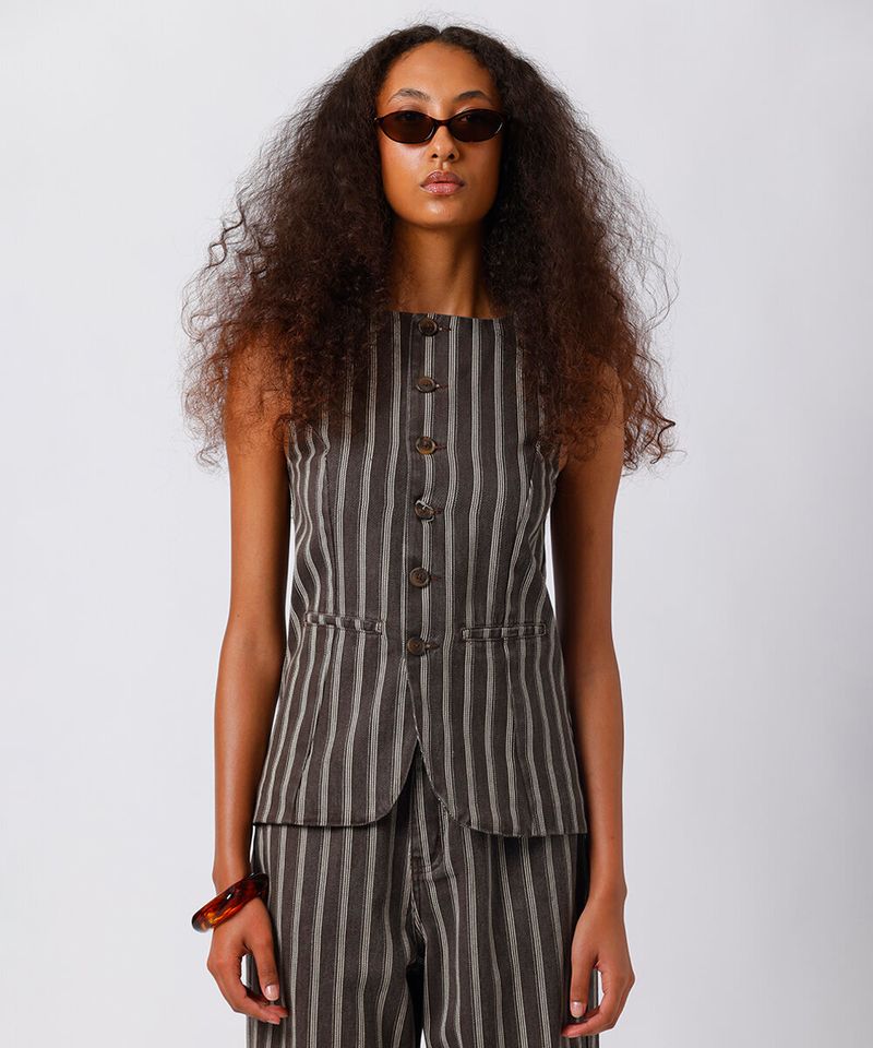 COLETE FEMININO DE SARJA LISTRADO MINDSET Colete feminino confeccionada em sarja com estampa listrada. A peça tem a modelagem e construção reta e o caimento é confortavelmente solto ao corpo. O modelo tem decote redondo, fechamento frontal por botões em vista e alças largas. Possui dois bolsos decorativos e acabamento pespontado na barra.
