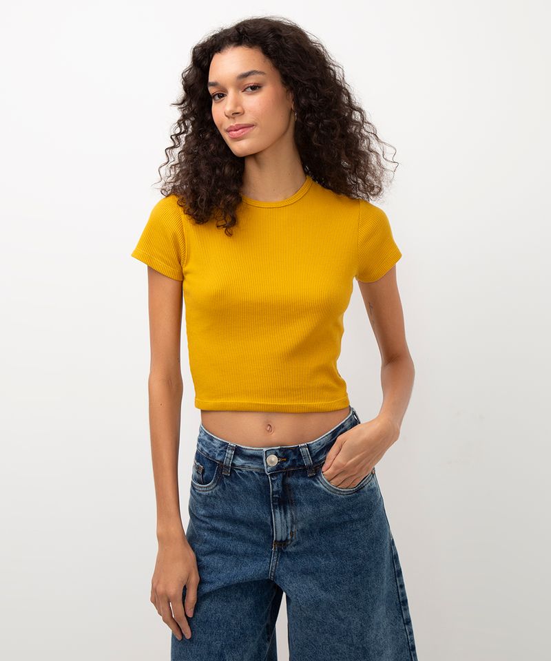 Cropped confeccionado em algodão texturizado. Possui modelagem baby look, gola redonda, mangas curtas e acabamentos pespontados.