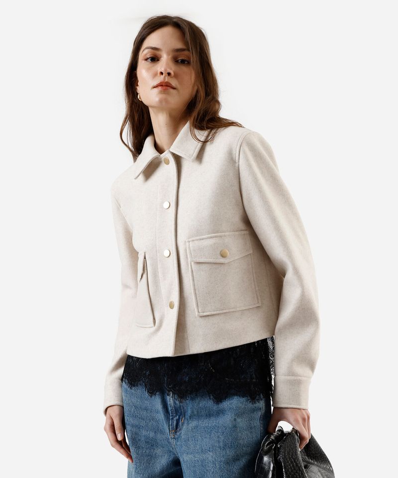 Jaqueta feminina confeccionado em tecido estruturado e texturizado. A peça tem a modelagem e construção reta e caimento solto ao corpo. O modelo tem gola esporte, fechamento por botões de pressão e mangas longas. Possui dois bolsos com lapelas.