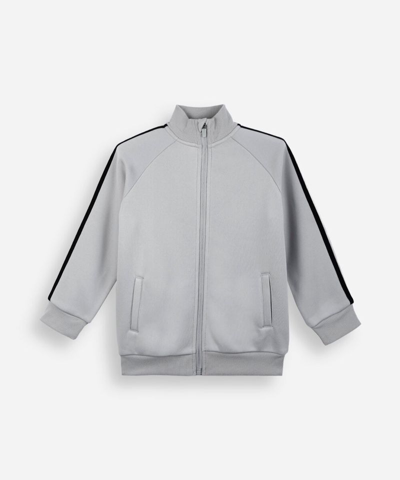 Jaqueta infantil confeccionada em moletom felpado. A peça tem a modelagem e construção reta e o caimento solto ao corpo. O modelo tem gola alta, fechamento por zíper e mangas raglan longas com listras contrastantes aplicadas. Possui dois bolsos e acabamento em malha canelada, nos punhos, gola e na barra.