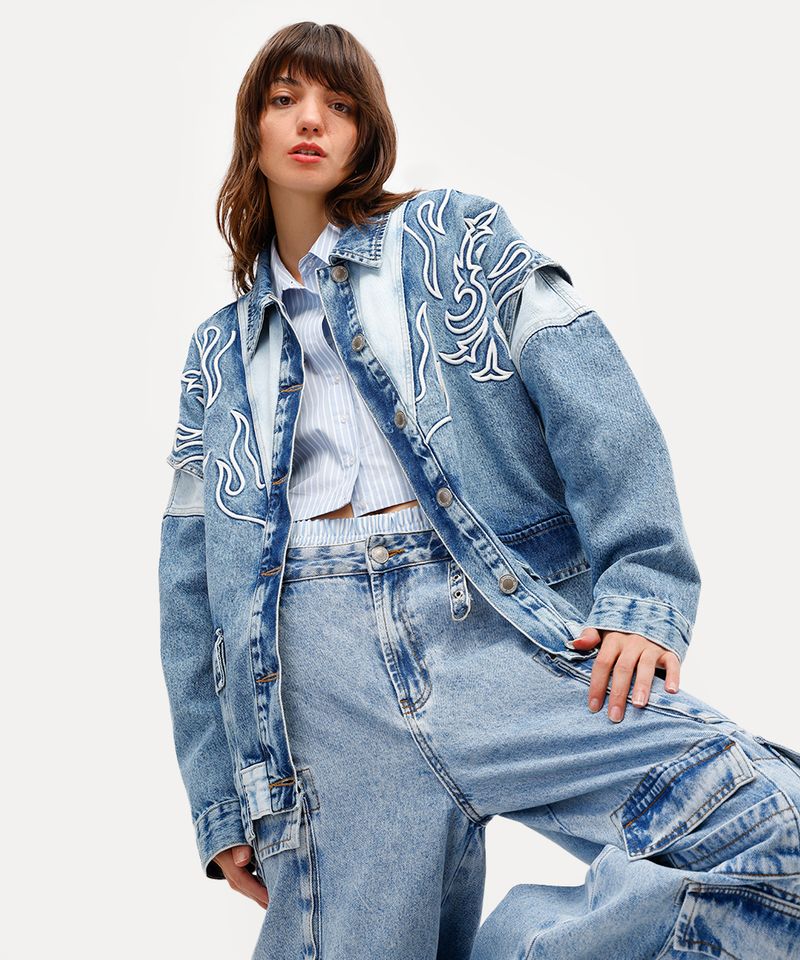 Adicione um toque de atitude e estilo ao seu visual com esta jaqueta jeans. Com uma modelagem oversized que é tendência, esta peça combina conforto e um design autêntico, sendo uma ótima opção de casaco feminino para diversas ocasiões. Os detalhes de bordado tribal e o mix de lavagens criam um efeito único, perfeito para quem ama se destacar com personalidade.