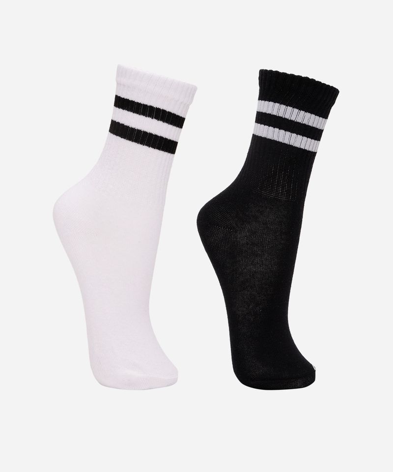 • Kit com 2 pares de meias, um par na cor preta com listras brancas e outro na cor branca com listras pretas.